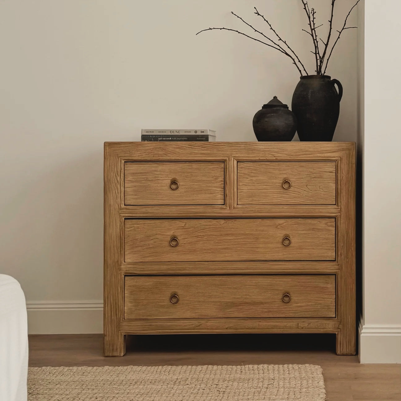 Created for smaller spaces, these chests are a practical storage solution without compromising on style and available in 2 of our signature finishes. Four drawers with antique brass hardware - an absolute must-have for any Aussie Bedroom.