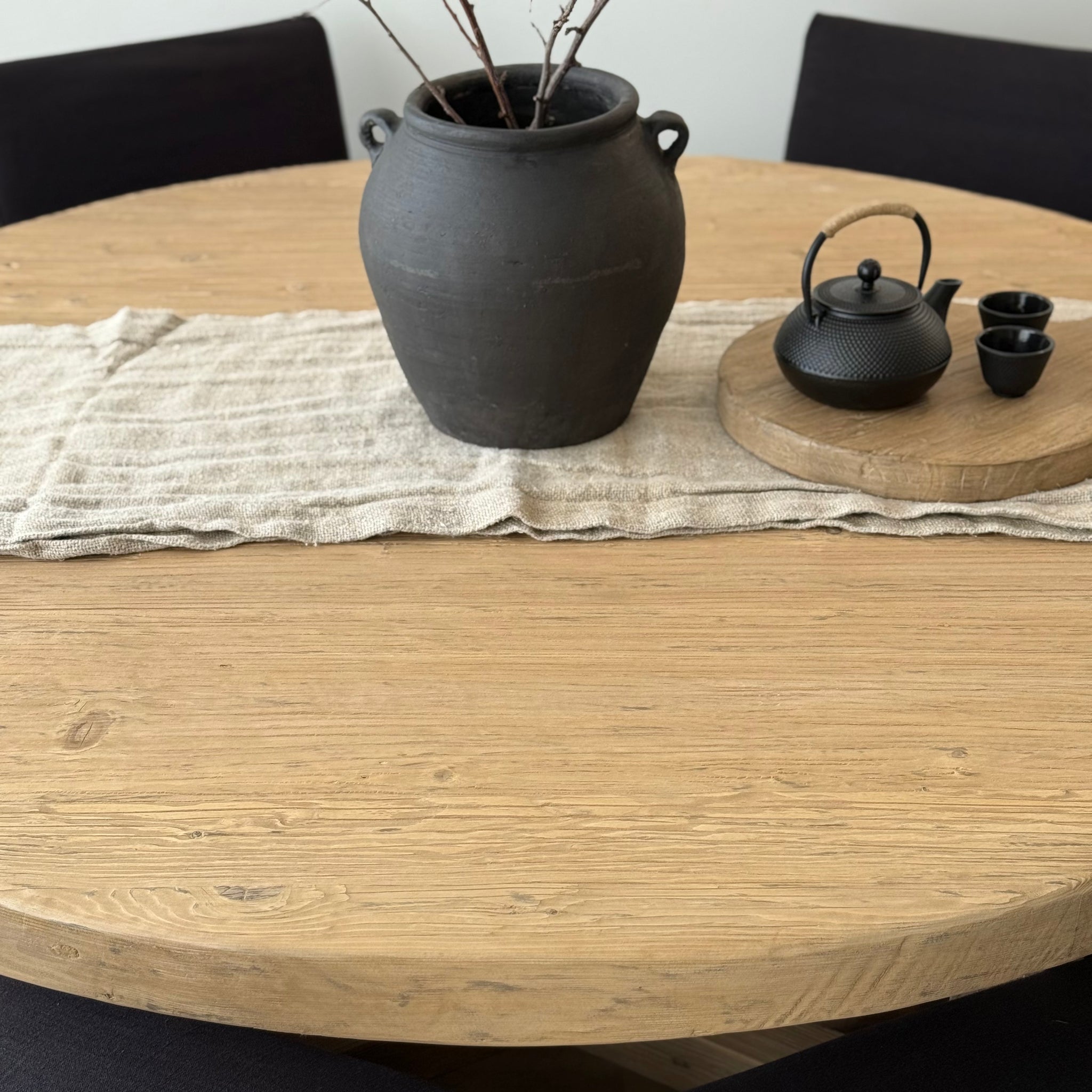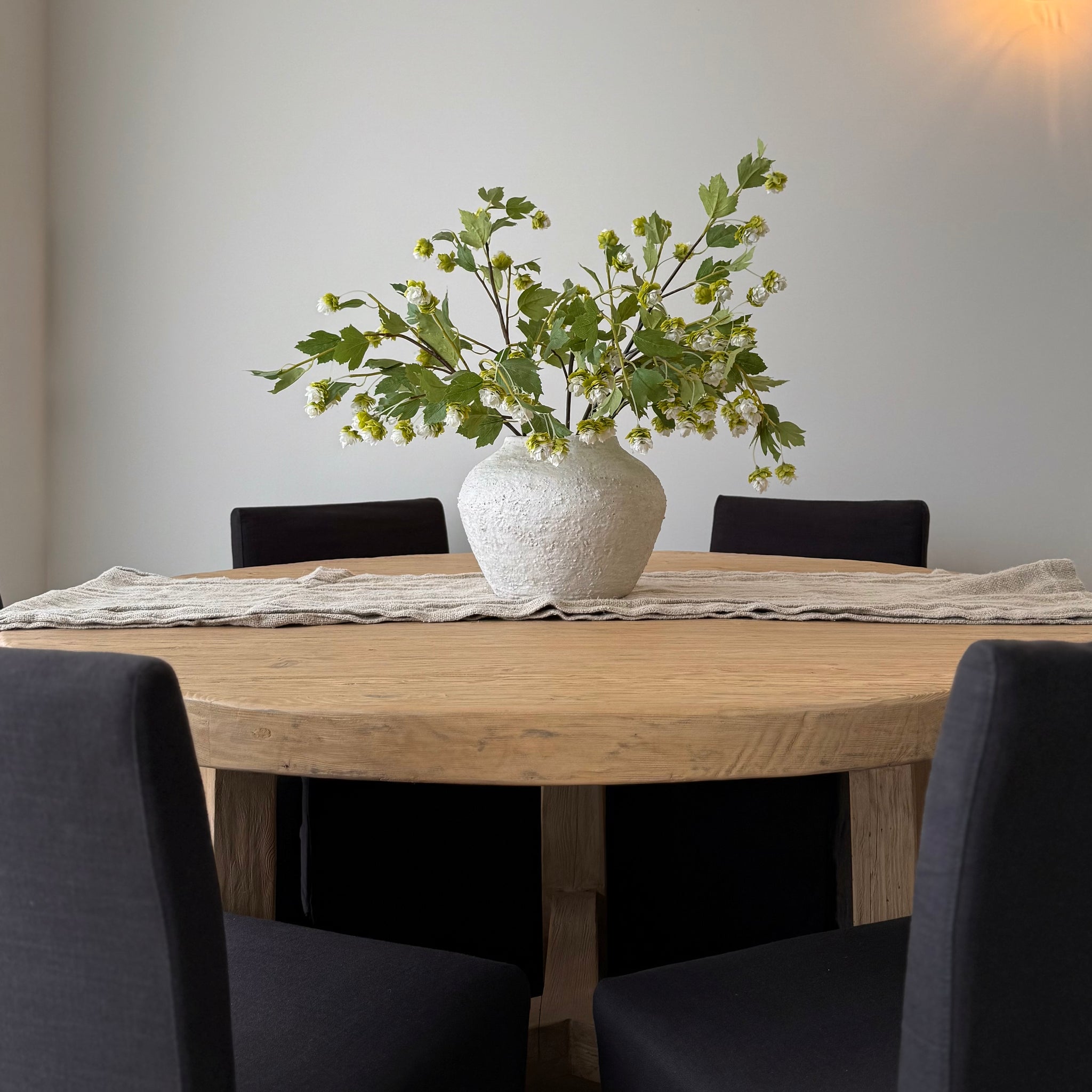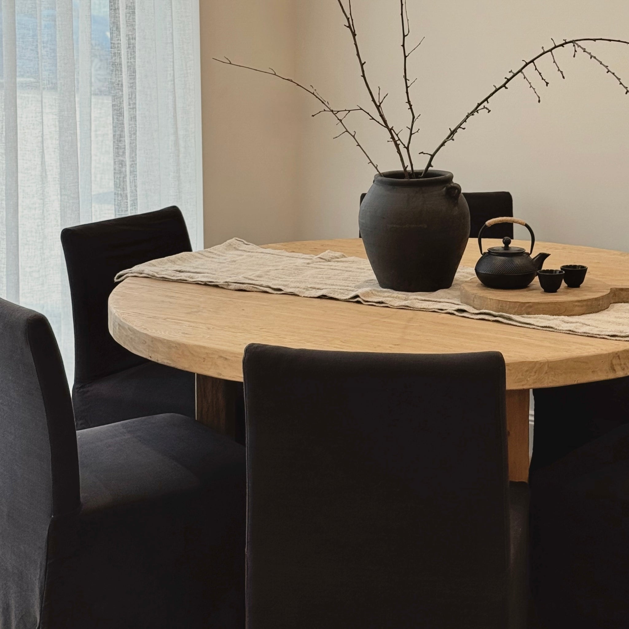The organic round shape softens a room filled with straight lines, inviting balance and togetherness. With its modern curves and honey-toned finish, this table strikes the perfect balance between farmhouse charm and coastal sophistication - Full of character without compromising on style or luxury.