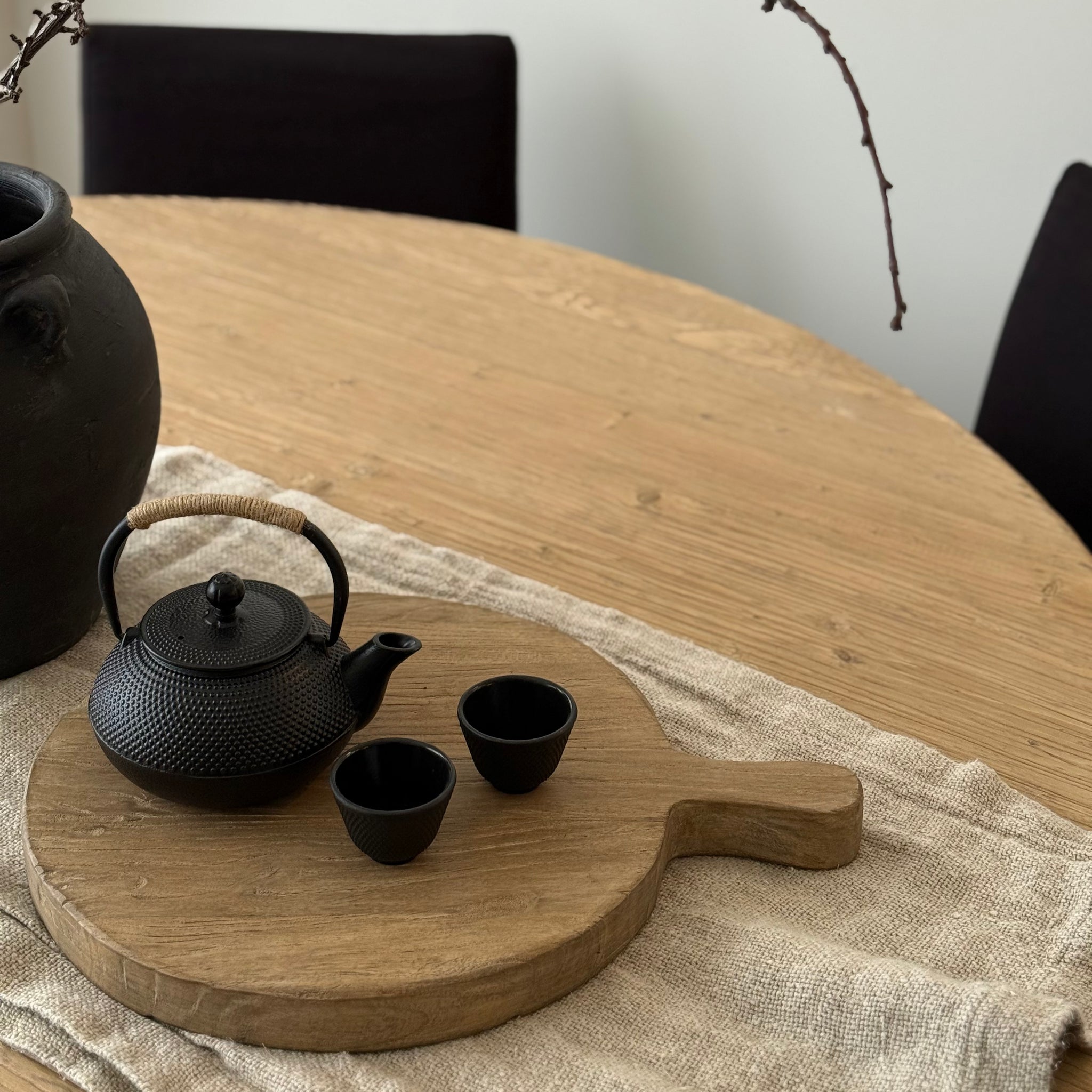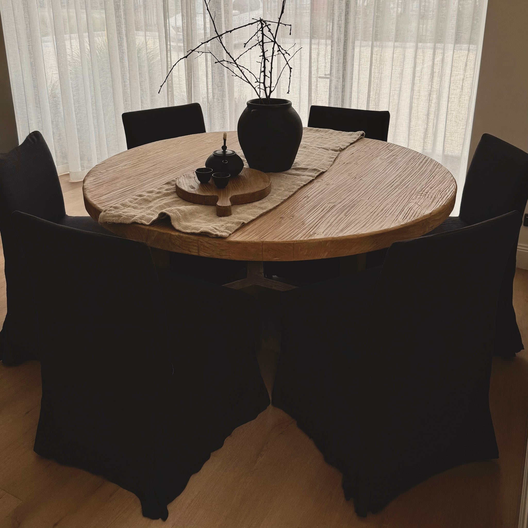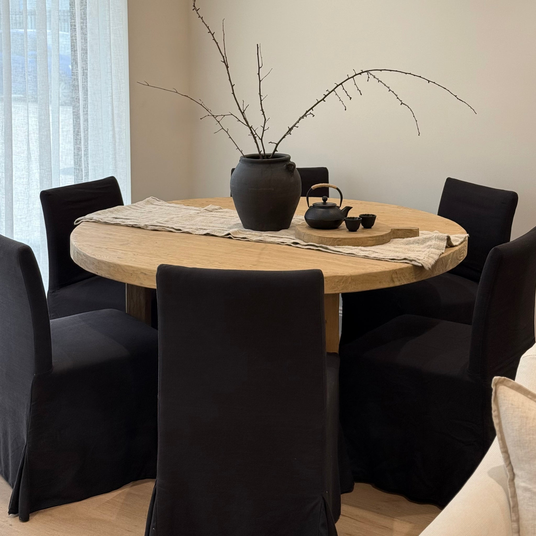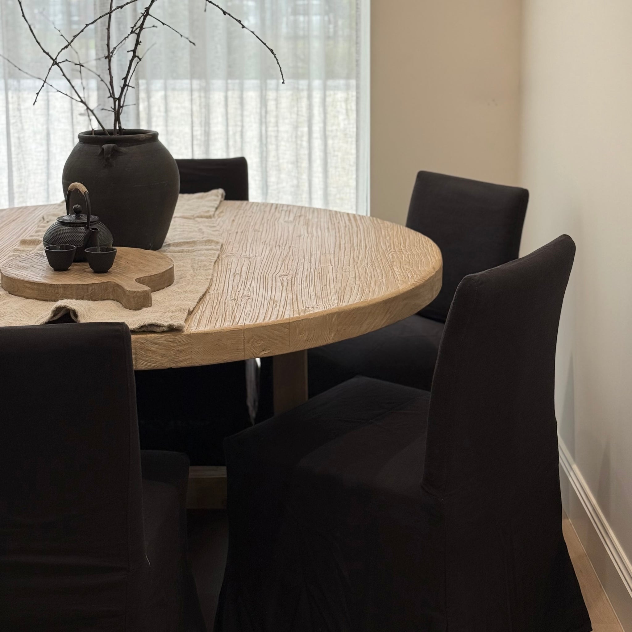 The organic round shape softens a room filled with straight lines, inviting balance and togetherness. With its modern curves and honey-toned finish, this table strikes the perfect balance between farmhouse charm and coastal sophistication - Full of character without compromising on style or luxury.