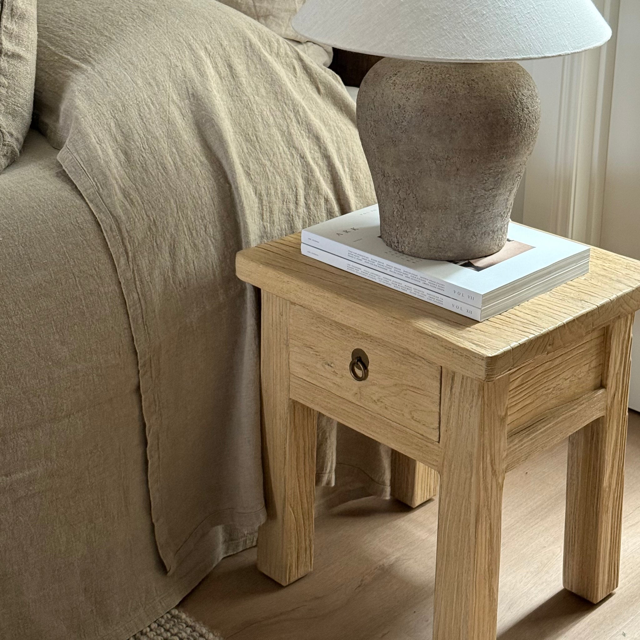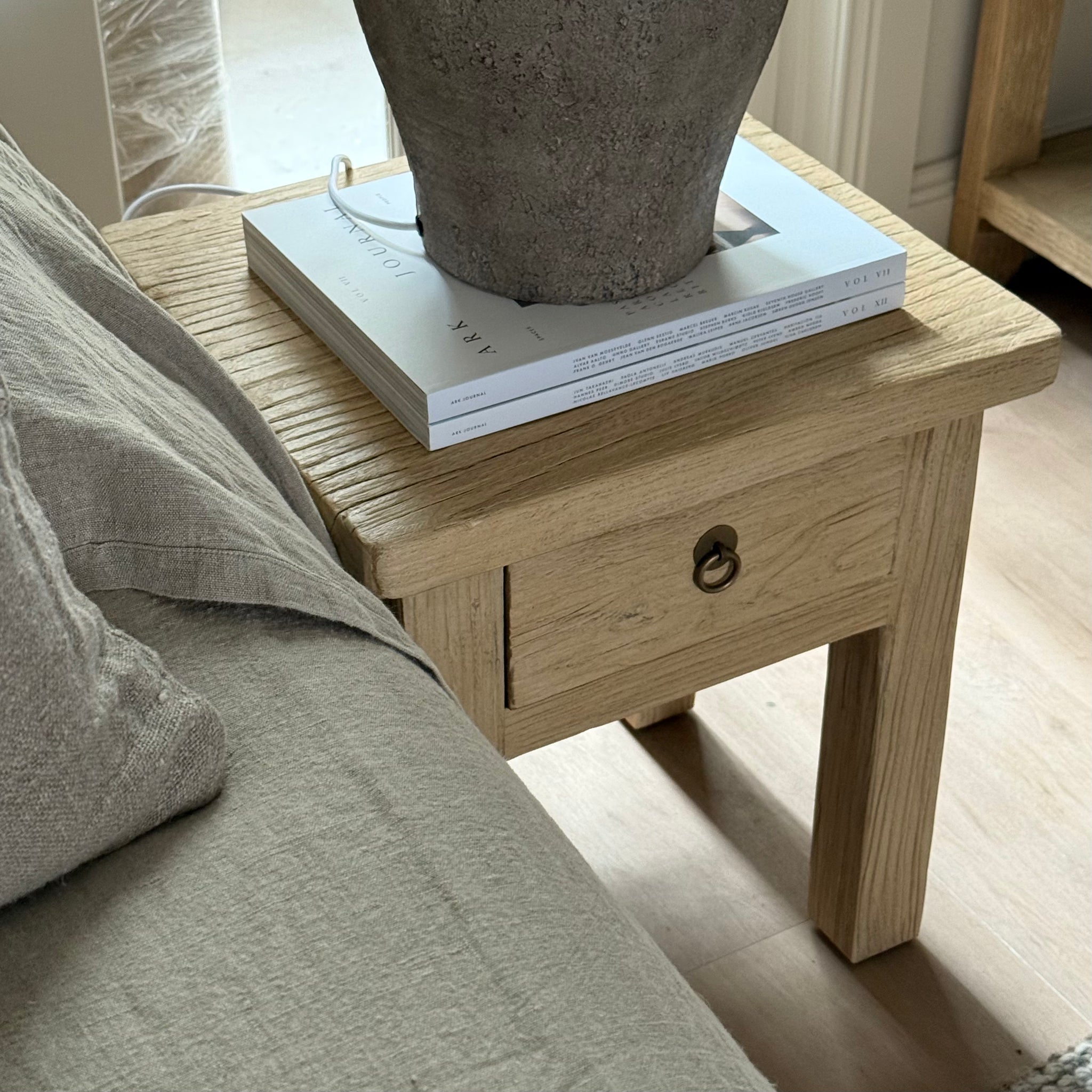 Each piece is full of organic texture and grain detail. Featuring a drawer for added storage, with antique brass hardware - a touch of elegance and visual contrast.