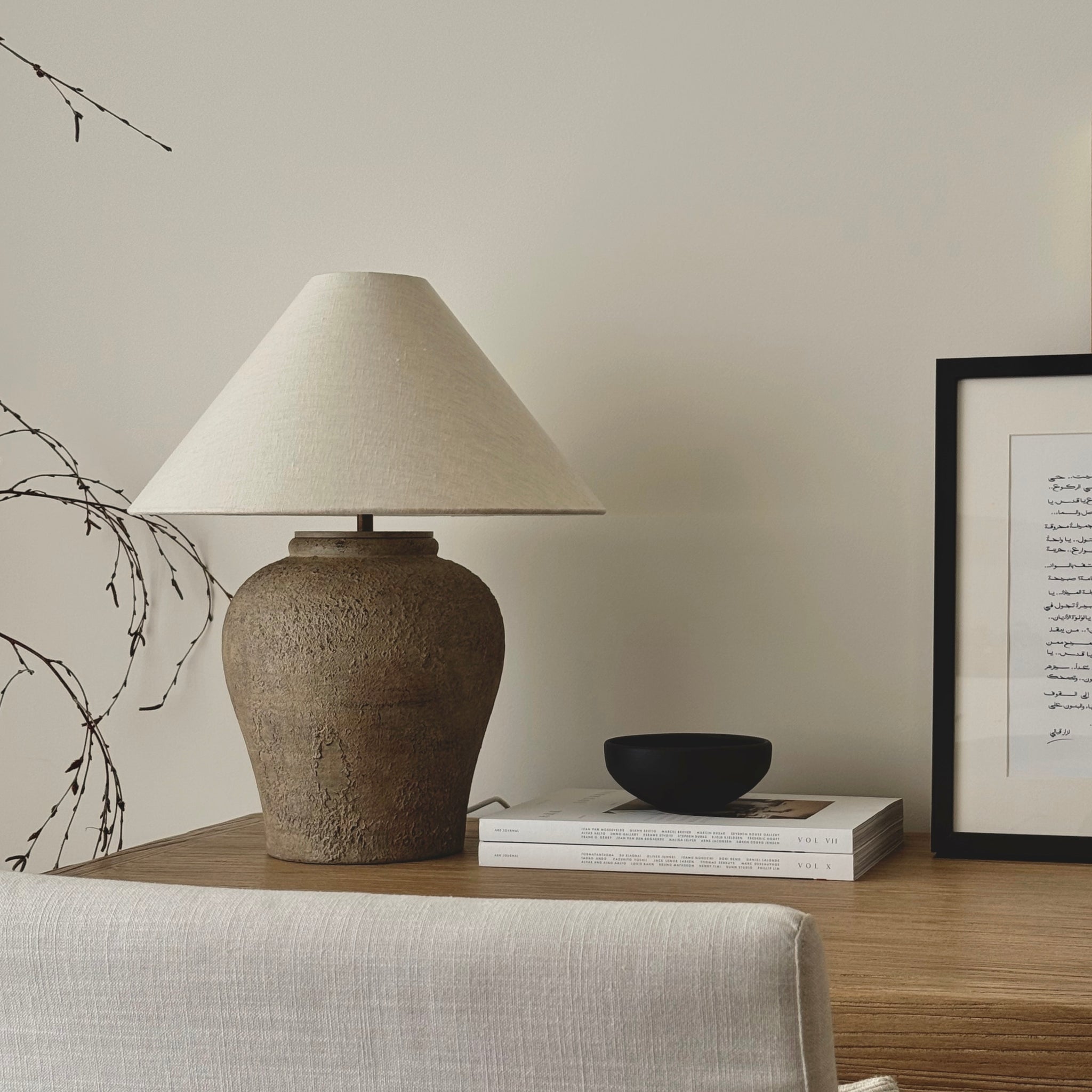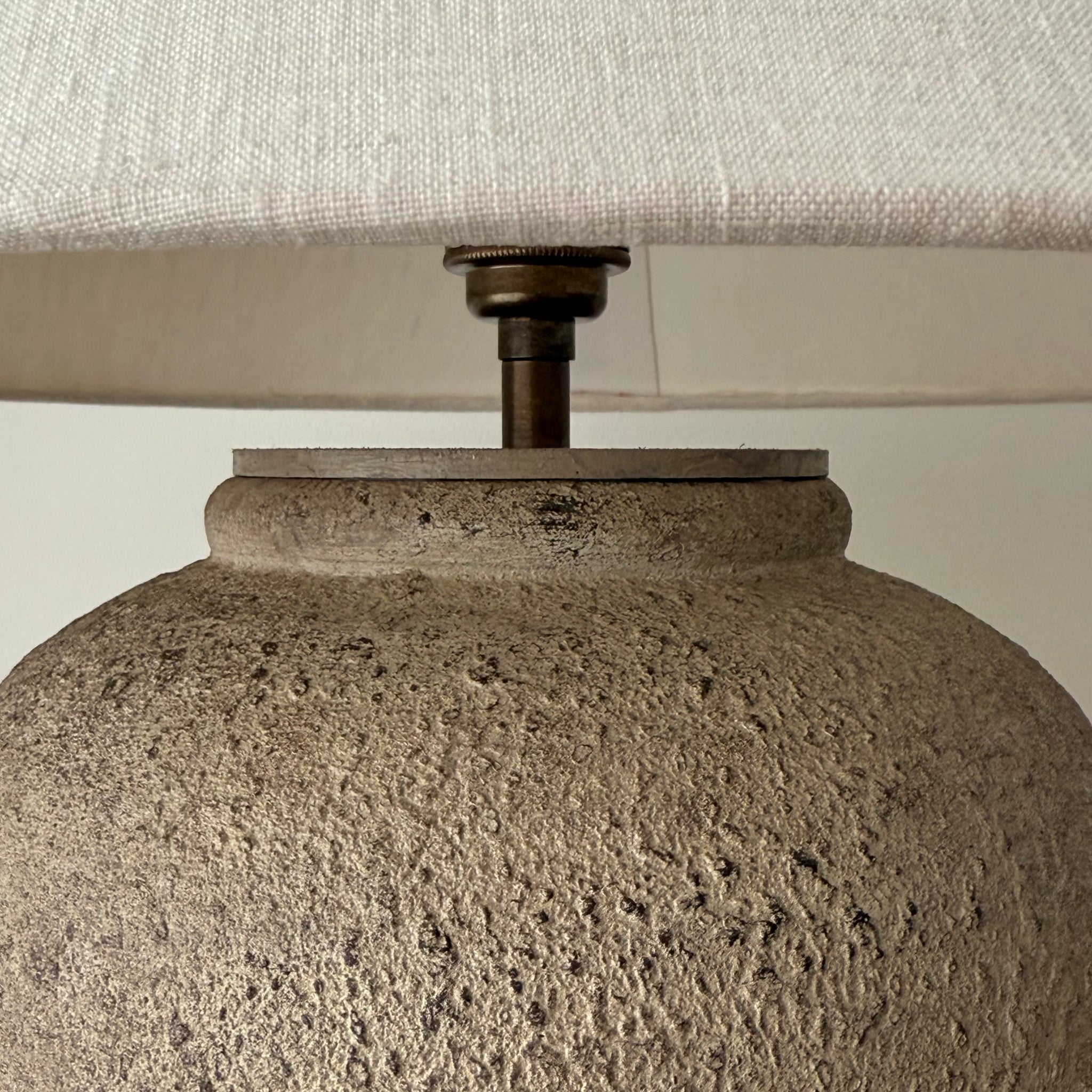 The tactile, sculpted base in a neutral, earthy Grey/Beige, finish with black stone specs is paired with a custom made, Ivory linen shade, offering a balanced presence in any space. Perfect for those seeking a unique statement piece (not mass produced) and creating a warm, soulful interior with a refined, minimalist edge. The textural details give it an authentic, weathered look, evoking the essence of ancient terraces.