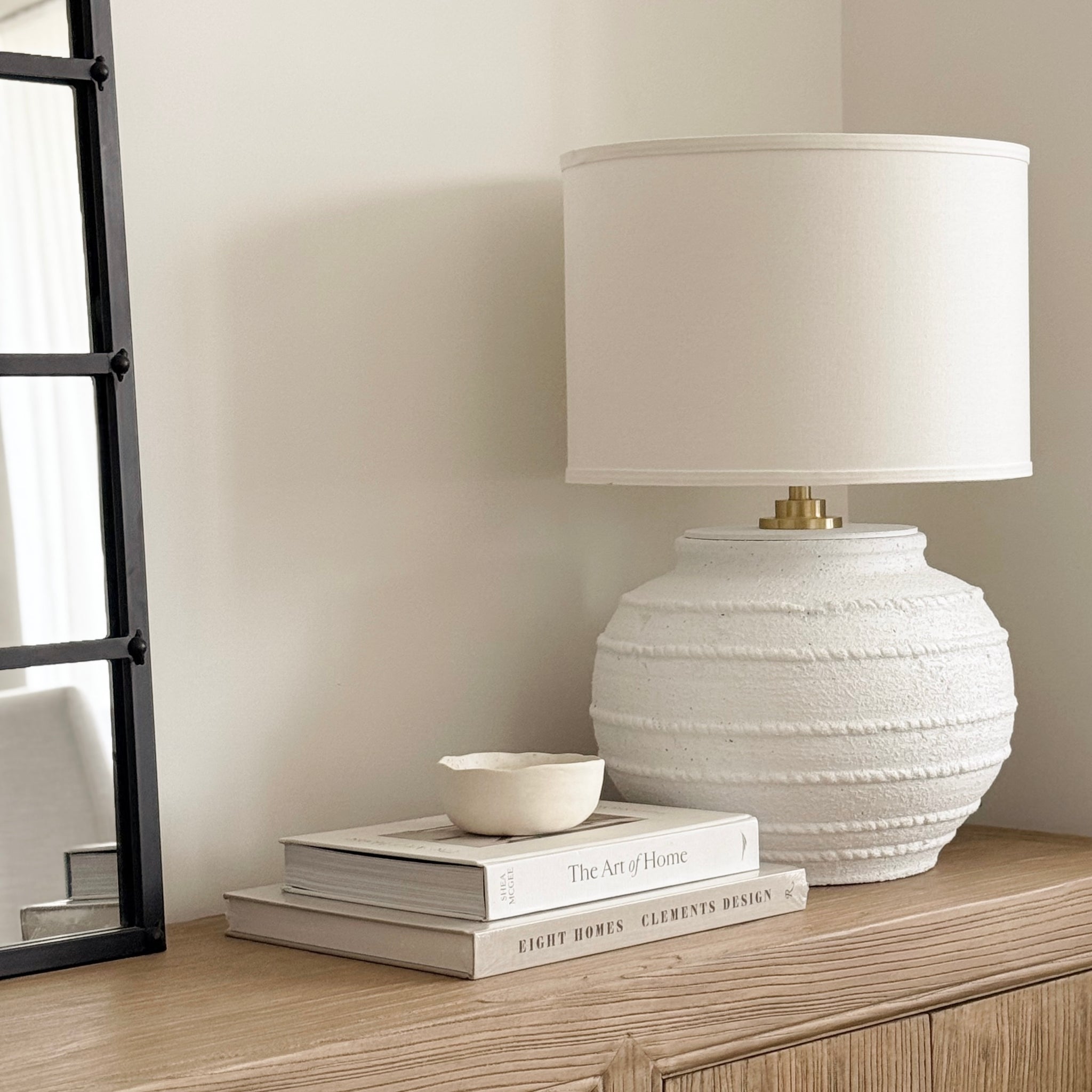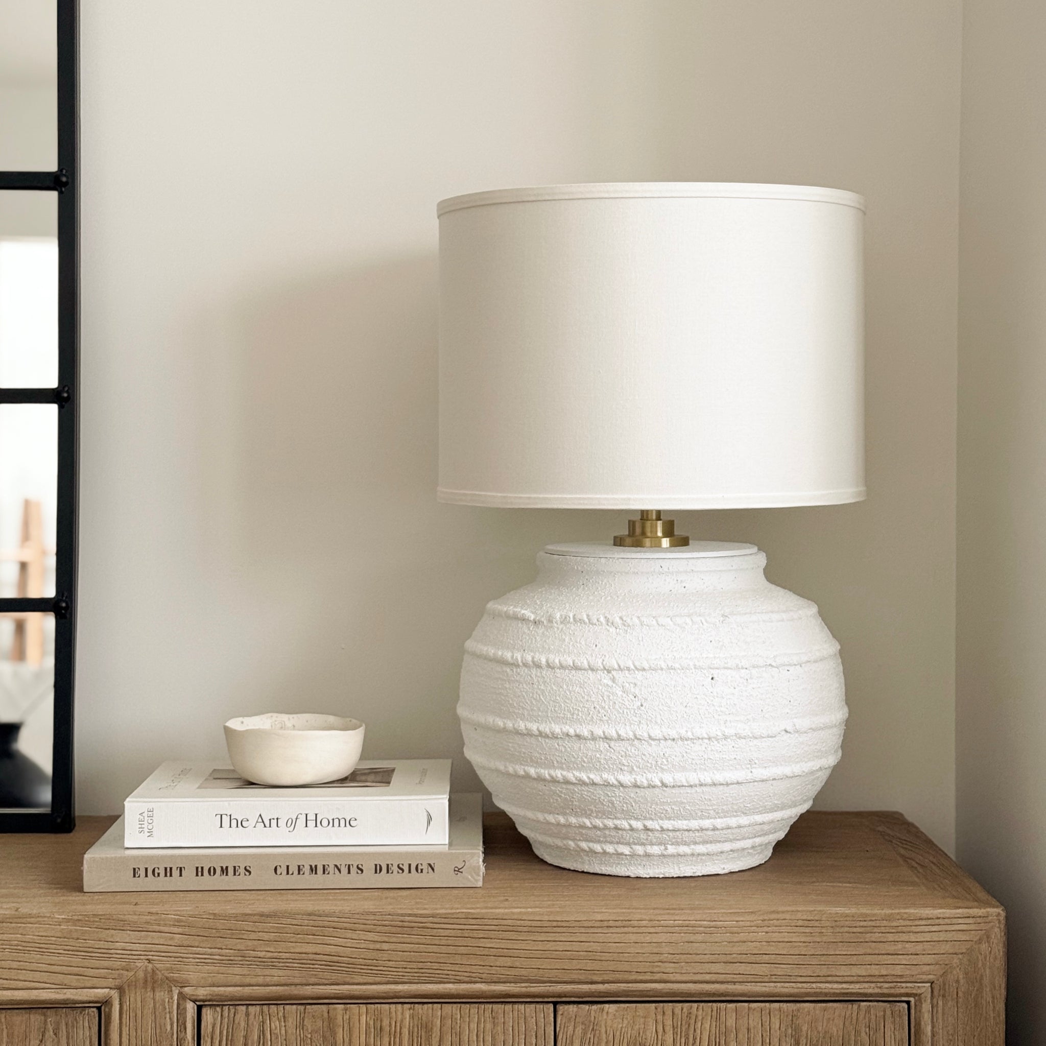 Textural details give it an authentic, weathered look, evoking the essence of coastal villas and ancient terraces. Feat: middle eastern ‘belt’ design, brass lamp holder and an Ivory linen, drum shade for a classic/timeless look.